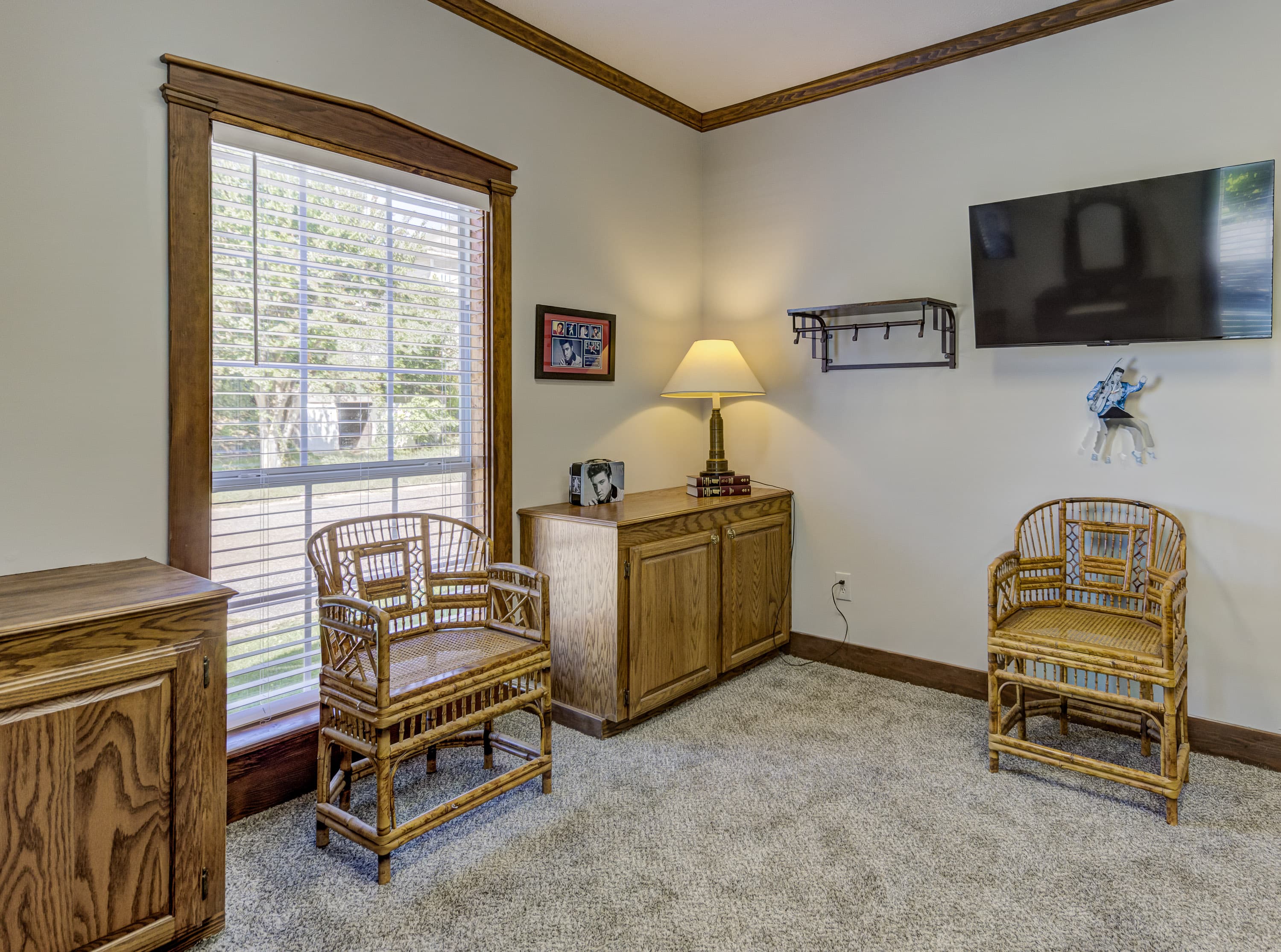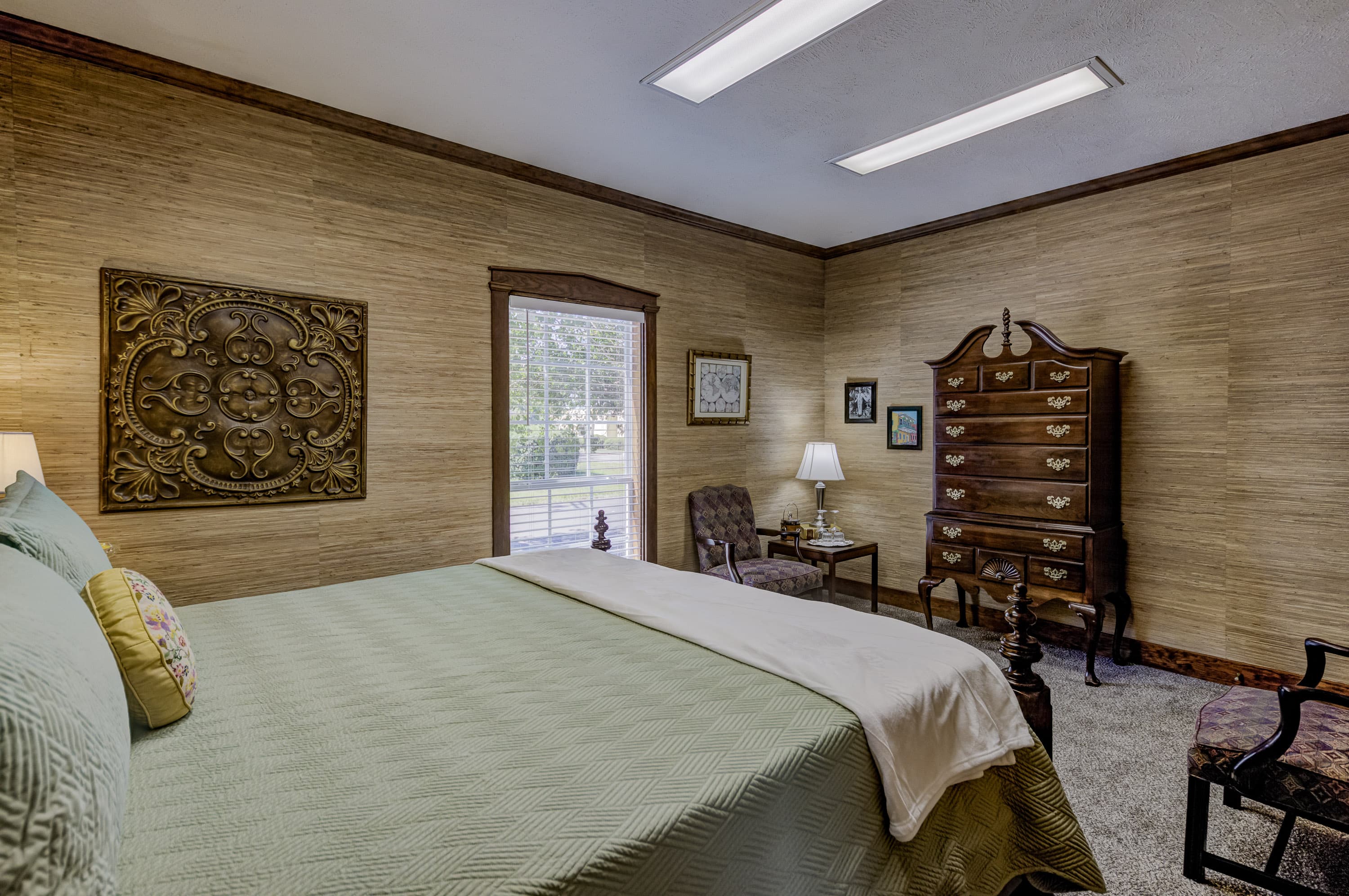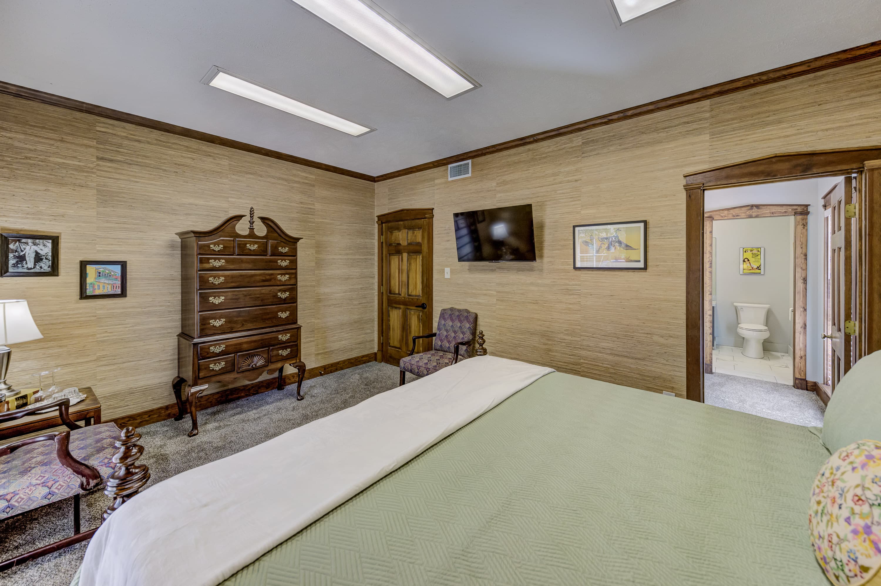 The John Grisham is a spacious first-floor room featuring a dormer, a walk-in closet, a queen-size bed and an ensuite bathroom with a walk-in shower.